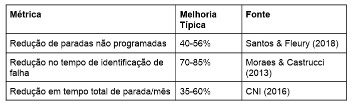 - Efetividade comprovada: Literatura documenta ganhos consistentes de 40-56% em redução de paradas, 25-35% em custo de manutenção e 15-35% em produtividade.