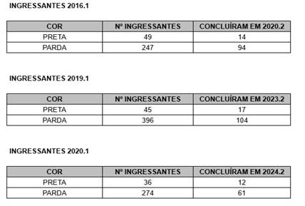 No ingresso de 2016.1, observa-se que, dos 49 estudantes pretos, apenas 14 concluíram o curso até 2020.2, enquanto entre os 247 estudantes pardos, 94 alcançaram a conclusão. Situação semelhante é verificada no ingresso de 2019.1, no qual 17 dos 45 estudantes pretos concluíram o curso até 2023.2, ao passo que, entre os pardos, 104 dos 396 ingressantes finalizaram a graduação. Já no ingresso de 2020.1, os dados indicam que 12 dos 36 estudantes pretos e 61 dos 274 estudantes pardos concluíram o curso até 2024.2.