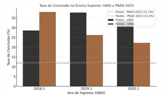 Na UNIG, as taxas de conclusão para estudantes pretos oscilaram entre 28,6% e 37,8%, enquanto entre os pardos variaram de 22,3% a 38,1%. Esses resultados revelam uma tendência positiva em relação à permanência e conclusão no ensino superior, sobretudo quando comparados aos dados nacionais da Pesquisa Nacional por Amostra de Domicílios Contínua (PNAD, 2023), segundo a qual apenas 11,7% das pessoas pretas e 12,3% das pardas com 25 anos ou mais concluíram o ensino superior no Brasil. As políticas de cotas trouxeram avanços significativos, promovendo diversidade e inclusão, mas ainda insuficientes diante das disparidades reveladas por indicadores do PNAD (2023), como maior taxa de analfabetismo e menor escolaridade média da população negra. Constatou-se também a necessidade de associar o acesso universitário a políticas de permanência e valorização da história e cultura afrobrasileira.