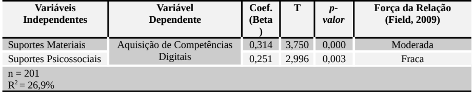 No modelo apresentado (Tabela 15), ambos suportes se relacionam significativamente com a aquisição de competências digitais, contudo com intensidades diferentes.