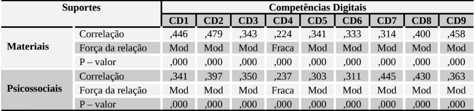 Suportes materiais estão associados com aquisição de competências digitais com força moderada (B = ,314; p-valor = ,000). Já os suportes psicossociais estão relacionados com aquisição de competências digitais com intensidade fraca (B = ,251; p-valor = ,003), ainda que também significativa.