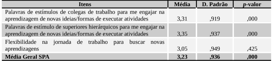 O item “Palavras de estímulo de superiores hierárquicos para me engajar na aprendizagem de novas ideias/formas de executar atividades” foi o que apresentou maior nível de percepção (μ = 3,35; p-valor = ,000).