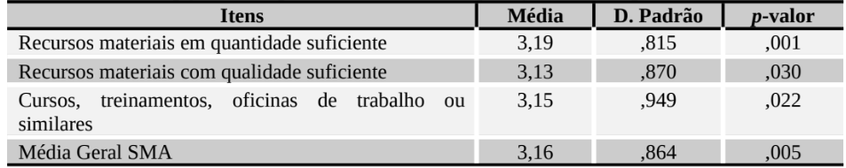 O item “Recursos materiais em quantidade suficiente” foi o que apresentou maior nível de percepção (μ = 3,19; p-valor = ,001), enquanto o item “Recursos materiais com qualidade suficiente” foi o de menor média (μ = 3,13; p-valor = ,030) entre eles.