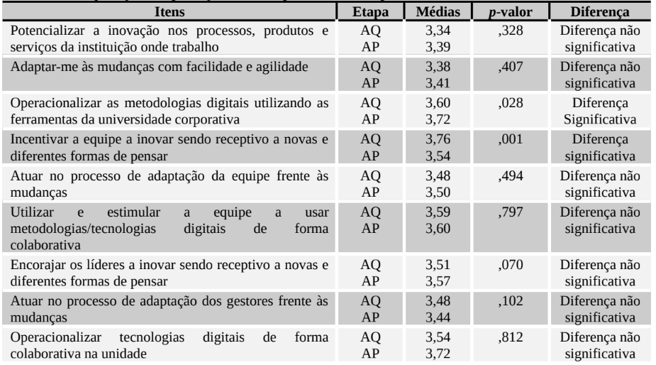 De modo contrário, a competência “Operacionalizar as metodologias digitais utilizando as ferramentas da universidade corporativa” (μ AQ = 3,60; μ AP = 3,72; p-valor = ,028) apresentou um nível de aplicação superior ao nível de aquisição. Tal resultado indica que a percepção de aplicação desses indivíduos supera a percepção de aquisição dessa competência.