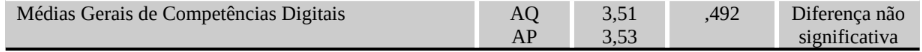 A Tabela 1 apresenta os resultados dos testes t de médias realizados para medir: o nível de aquisição de competências (AQ) e o nível de aplicação de competências do trabalho (AP), conforme a percepção dos respondentes. A escala utilizada varia de 1 (mínimo domínio da competência digital) a 5 (máximo domínio da competência digital). Sugere-se que as médias que forem significativamente superiores ao ponto central (3,00) da escala, representam competências digitais que foram adquiridas em níveis significativos pelos funcionários. Além da apresentação dos níveis de aquisição (AQ) e Aplicação (AP) de modo separado, a Tabela 1 também apresenta a diferença de médias entre as duas variáveis, indicando, por meio do teste t (p-valor) se houve diferença significativa entre o que os indivíduos adquiriram e o que aplicaram no trabalho.