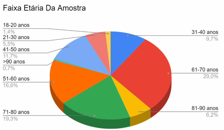 No âmbito das características sociodemográficas, em relação à faixa etária, a maioria dos pacientes são idosos, totalizando 55,2%(80) acima dos 60 anos, sendo a faixa etária entre 61-70 anos à de maior incidência (29% – 42); e apenas 7,6% (25) abaixo dos 30 anos de idade, conforme ilustra o gráfico 1. Quanto ao sexo, 48,3% (70) se declararam como sexo feminino, 51,7% (75) como masculino. O estado civil relatado pelos entrevistados resultou 29%(42) de solteiros; 32,4%(47) casados; 8,3%(12) em uma união estável; 17,2%(25) viúvos e 13,1% (19) divorciados. Na avaliação dos anos de escolaridade, foram encontradas taxas de 48,3%(70) para menos de 8 anos, 24,1% (35) para faixa entre 8-10 anos, e 27,6%(40) para mais de 10 anos.