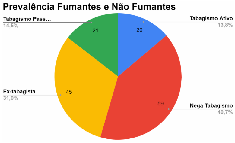 Quando a variável avaliada foi o tabagismo, 40,7%(59) dos participantes negaram uso prévio ou contato indireto com tabaco; 59,3% (86) apresentaram algum contato, seja ele direto ou indireto, sendo que 13,8%(20) do total são tabagistas ativos, 31%(45) ex-tabagistas e 14,5%(21) tabagistas passivos, conforme apresentado no Gráfico 2.