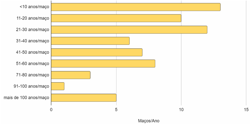 As características gerais associadas ao tabagismo foram parte da entrevista aplicadas apenas ao grupo de tabagistas e ex-tabagistas, totalizando 65 respostas. Observou-se que a maioria dos entrevistados (61,5%-40) iniciou o hábito de fumar entre os 11 aos 15 anos. O período de maior prevalência quanto ao tempo de tabagismo foi de 21-30 anos (27,7%-18). A carga tabágica foi bastante heterogênea entre os entrevistados, sendo que a maioria apresentou carga menor que 30 anos/maço (53,9%-35), conforme ilustrado no Gráfico 05.