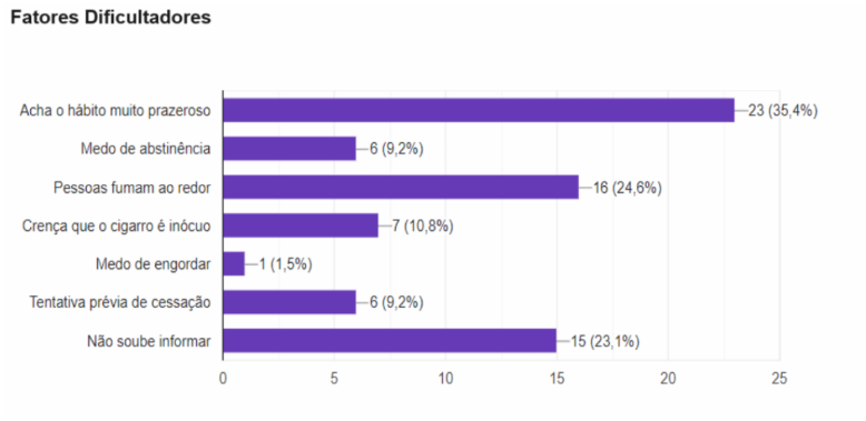 Influência de amigos e familiares foram os principais motivos de iniciação ao tabagismo relatados em parte significativa dos pacientes (75,4%), conforme ilustra o Gráfico 07. Quando questionados sobre fatores que foram ou são dificultadores para cessação do hábito, as respostas mais prevalentes foram “Achar o hábito muito prazeroso” e “Pessoas fumam ao redor”, totalizando 35,4%(23) e 24,6%(16), respectivamente, sendo que 23,1%(15) não souberam informar uma justificativa para tal dificuldade, como demonstrado em Gráfico 08.