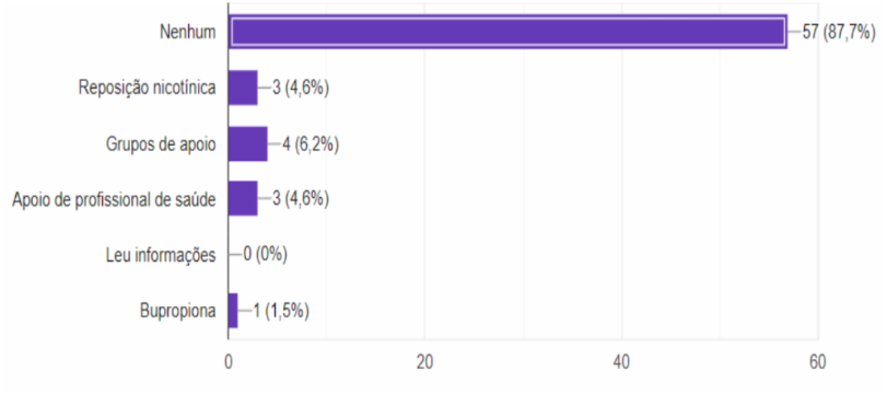 Englobando questões relacionadas ao tratamento do tema, foi-se questionado sobre abordagem do assunto em serviço de saúde, mesmo que breve, com o paciente que apresenta ou apresentou contato com tabagismo em algum momento da sua vida, encontrando-se taxas de 29,2%(19) que não tiveram nenhuma abordagem, mesmo durante internação; 7,7%(5) apenas durante esta hospitalização, e o restante, 64,5%(42), já possuíam experiências de abordagem prévia. Em relação à utilização de recurso medicamentoso ou não para auxílio na cessação, extrema maioria, totalizando 87,7% (57), não utilizou de nenhum, evidenciado em Gráfico 9.
