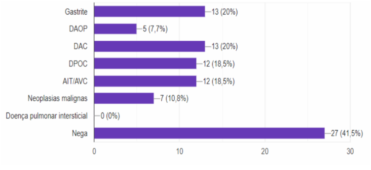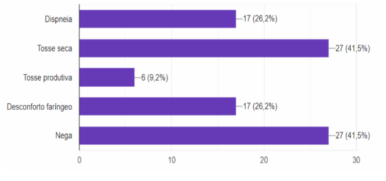 Ainda no grupo de tabagistas ativos e ex-tabagistas, foi analisado condições diretamente relacionadas à situação clínica do paciente, identificando-se presença de comorbidades relacionadas ao tabaco (dentre as avaliadas: gastrite, DAOP, DAC, DPOC, AIT/AVC, neoplasias malignas e doença pulmonar intersticial), estando presente pelo menos 1 comorbidade em 58,5% (38) dos pacientes. (gráfico 10); coexistindo sintomas respiratórios (dentre os avaliados: dispneia, tosse seca, tosse produtiva e desconforto faríngeo), em 58,5%(38) dos pacientes também, (gráfico 11).
