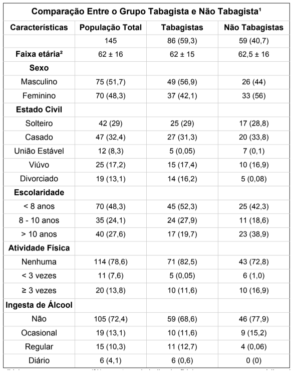 Ao se comparar o grupo de tabagistas e não tabagistas, conforme Tabela 1, evidenciado faixa etária semelhante entre os dois grupos (62±15 e 62,5±16, respectivamente), sendo as variáveis: sexo masculino, maior percentual de relações não conjugais atuais (solteiro, viúvo e divorciado), e maior consumo de álcool (hábito regular ou diário); mais prevalentes no grupo de tabagistas.