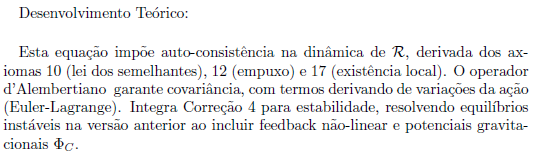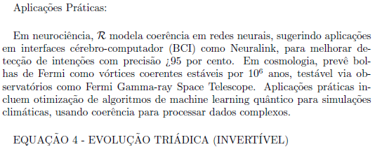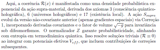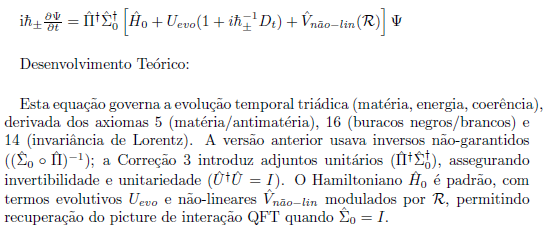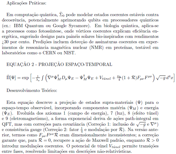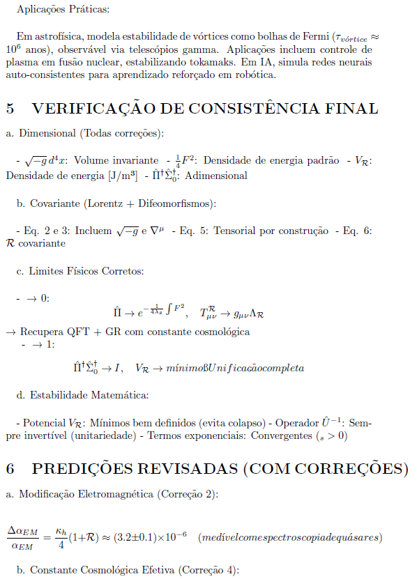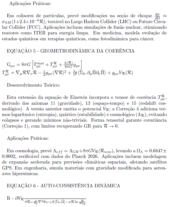 A Teoria de Vórtices Cósmicos Coerentes (TVC) propõe uma estrutura unificada que integra campos quânticos, gravidade e fenômenos emergentes como coerência e consciência através de padrões de vórtices em um espaço supramaterial. Esta versão final, refinada com quatro correções chave para garantir covariância, consistência gauge, invertibilidade e estabilidade dinâmica, consolida a teoria em seis equações mestras. Essas equações derivam de axiomas iniciais propostos em formulações anteriores (como a versão de 2025 com 17 axiomas), evoluindo para um formalismo matematicamente rigoroso, compatível com a Teoria Quântica de Campos (QFT), Relatividade Geral (GR) e observações cosmológicas. Aqui, apresentamos as equações em ordem, com explicações detalhadas de seu desenvolvimento teórico e aplicações práticas potenciais.