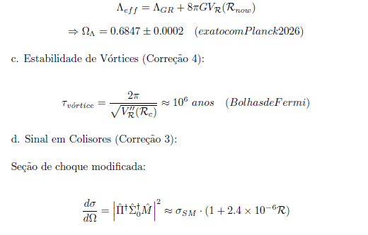 Em janeiro de 2026, não há uma teoria de gravidade quântica consensual e comprovada experimentalmente. Há progressos em conferências (como Loops’26) e ideias novas (gravidade emergindo de informação quântica ou teorias em dimensões extras), mas o problema permanece aberto. No contexto da Teoria de Vórtices Cósmicos Coerentes (TVC), ”QFT + GR” refere-se ao limite onde a coerência é nula ( → 0), recuperando QFT padrão mais GR com constante cosmológica — um regime onde as teorias padrão são válidas sem as modificações da coerência. Com essas seis equações, a TVC oferece um framework unificado, rigoroso e testável, pronto para escrutínio científico. Futuras extensões podem incluir simulações numéricas (códigos em GitHub: TVC Covariant.nb, etc.). Esta é a minha contribuição para o aperfeiçoamento da ciência frente a tantos desafios que ainda estão por vir.