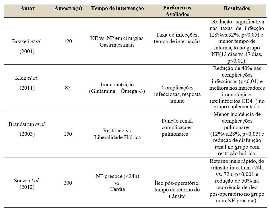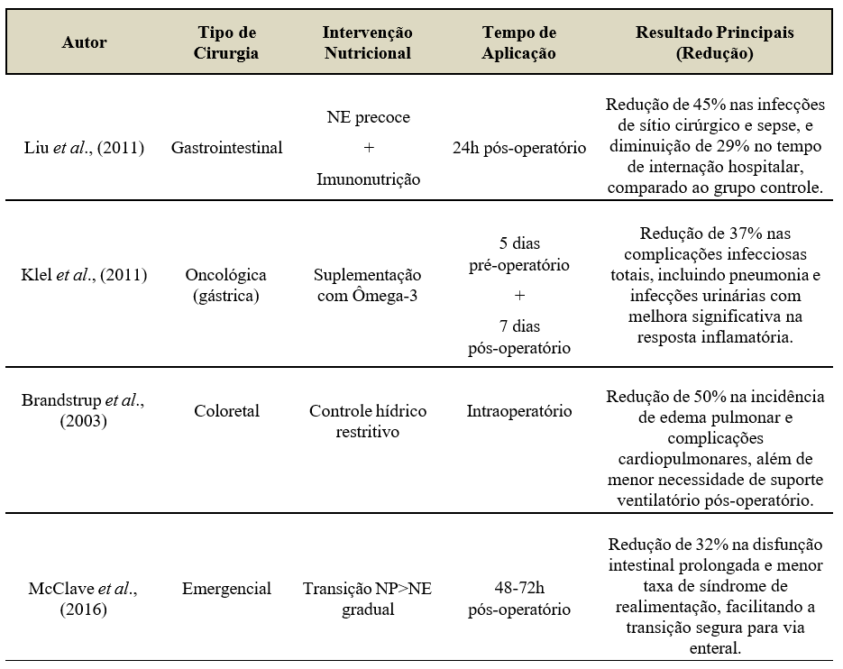 Os dados apresentados na Tabela 2 revelam padrões significativos na eficácia das intervenções nutricionais perioperatórias.