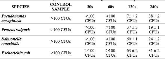 Table 1: Microbial control curve by UV-C irradiation considering time variation, and fixed distance.