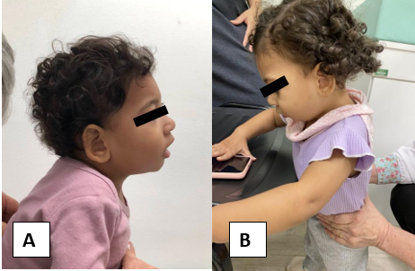 Patients with craniofacial alterations were submitted to physiotherapy and osteopathy, followed by maxillofacial surgery, focusing on myomodulation and muscle strengthening therapies, mainly to strengthen the masticatory muscles and facial expression with manual excitatory stimuli. In addition to strengthening and developing the neck muscles as seen in Figure 5 with image A; demonstrating patient with shortening of the neck muscles and in image B; patient already with cervical control and stability.