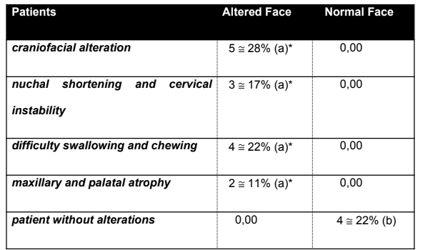 Of the patients seen, it was observed mainly changes in craniofacial growth (head circumference and z angle) 5 (28%), nuchal shortening and cervical instability 3 (17%), difficulty swallowing and chewing 4 (22%), maxillary and palatal atrophy 2 (11%), patient without changes 4 (22%) (Figure 4).