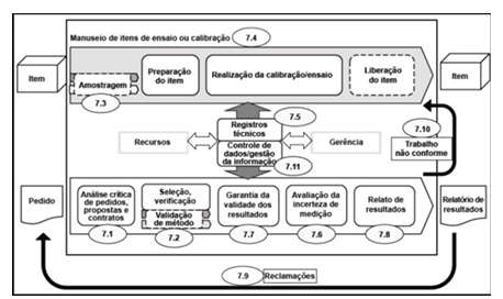 O item 7 da ISO/IEC17025 trata dos requisitos de processo que cobrem o escopo técnico, específico para a competência de laboratórios de ensaios e calibração (ABNT, 2017). A Figura 1 representa uma possível estruturação dos processos envolvidos na operação de um laboratório, que inclui os tópicos análise de contratos (7.1), métodos (7.2.), amostragem (7.3), manuseio de itens (7.4), registros (7.5), incerteza de medição (7.6), garantia da validade dos resultados (7.7) e relato de resultados (7.8), além do tratamento de reclamações (7.9), trabalhos não conformes (7.10) e integridade de dados (7.11).