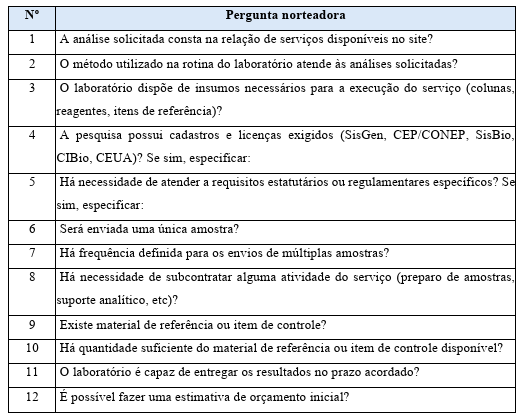 O roteiro orienta a verificação do atendimento aos requisitos mínimos para o serviço, da disponibilidade de equipamentos e de insumos necessários à técnica e ao método indicados, da possibilidade de execução da técnica e da adequação dos ensaios aos objetivos desejados (questões 1 a 3).