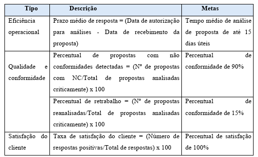 Os indicadores de qualidade e conformidade “Percentual de propostas com não conformidades detectadas” e “Percentual de retrabalho” verificam a aderência aos requisitos técnicos e normativos. O primeiro indicador monitora a conformidade documental e técnica frente ao POP e à norma ISO 17025:2017, enquanto o segundo identifica falhas ou informações insuficientes nas análises, que acarretem reavaliações ou necessidade de complementação de dados.