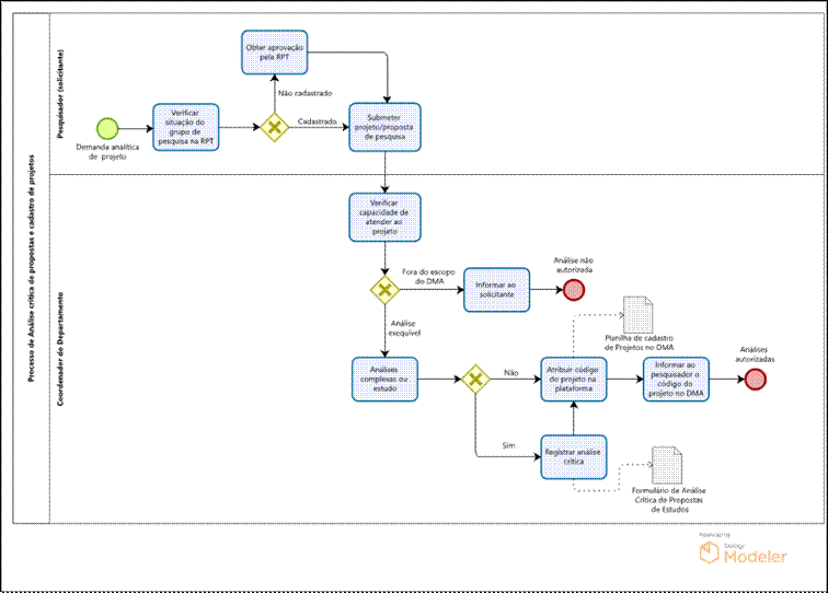 O responsável pela pesquisa ou o solicitante da(s) análise(s) deve apresentar um breve resumo do projeto para definição do escopo analítico e do suporte técnico demandado. Caso a análise seja exequível, esteja no âmbito da saúde pública e não tenha restrições legais ou sanitárias o projeto recebe um número de cadastro no Departamento. Nesse momento deve ser indicado se trata-se de uma análise de rotina ou um estudo analítico. No caso de análises mais complexas, como estudos que envolvam várias técnicas analíticas, diferentes profissionais da equipe, o desenvolvimento e a qualificação de novas metodologias, a análise crítica deve ser formalizada por meio do formulário.