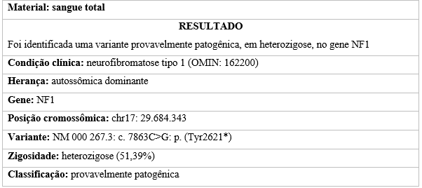 Não foram observados neurofibromas nem freckling axilar, e a quantidade de manchas “café com leite” não permitia o fechamento do diagnóstico clínico de neurofibromatose tipo 1. Todavia, o teste genético indicou uma variante provavelmente patogênica, em heterozigose, no gene NF1 (Tabela 1).