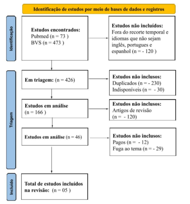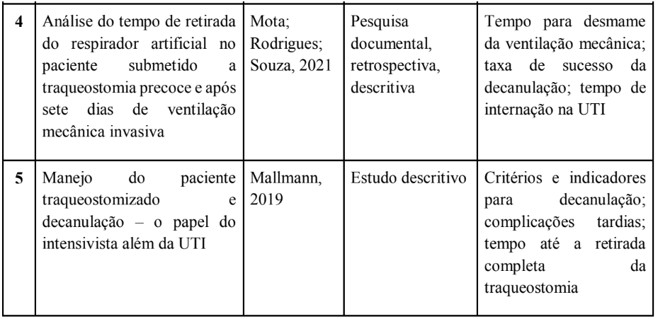 Os critérios de inclusão compreenderam artigos originais, publicados entre 2019 e 2025, envolvendo pacientes adultos, disponíveis na íntegra e que abordassem ao menos um dos aspectos de interesse: complicações, indicadores de desmame ou desfechos hospitalares relacionados à traqueostomia. Foram excluídos estudos de revisão, relatos incompletos, trabalhos duplicados, pagos ou que não apresentassem relação direta com o tema investigado. Após a aplicação desses critérios, cinco estudos foram selecionados para compor a amostra final da revisão. O processo de triagem e seleção dos artigos foi detalhado na Figura 1, que ilustra o fluxo de identificação, exclusão e inclusão dos estudos.