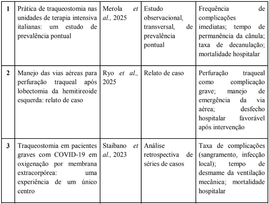 Este estudo caracteriza-se como uma revisão integrativa da literatura. Para a condução deste estudo, formulou-se a seguinte pergunta norteadora: Quais são as complicações mais frequentes, os indicadores de desmame e os desfechos hospitalares associados à realização de traqueostomia em pacientes adultos submetidos à cirurgia geral? A busca foi realizada nas bases de dados PubMed e BVS, utilizando combinações de descritores cadastrados nos DeCS e MeSH, em português, espanhol e inglês, com a aplicação dos operadores booleanos “AND” e “OR” para ampliar e refinar os resultados. (traqueostomia OR tracheostomy OR traqueostomía) AND (cirurgia geral OR general surgery OR cirugía general) AND (complicações OR complications OR complicaciones OR desfechos hospitalares OR hospital outcomes OR resultados hospitalários OR desmame OR weaning)