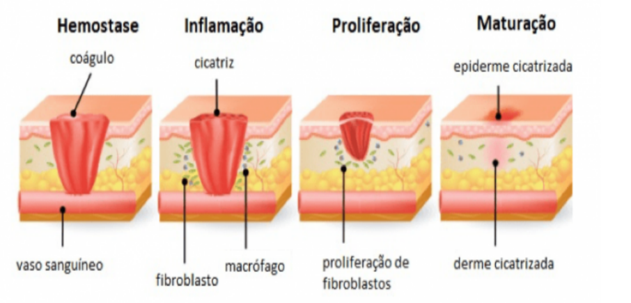 A primeira fase da cicatrização, caracterizada como inflamação, acontece imediatamente após a lesão e ocorre a formação de um coágulo de sangue para interromper o sangramento, esta fase geralmente conclui-se após três dias. A fase de proliferação ocorre após quatro dias, sendo responsável pelo fechamento da ferida, e envolve o processo de reepitelização, com formação do tecido de granulação, angiogênese e transporte de oxigênio e nutrientes para o metabolismo celular local. Por fim, tem a fase de remodelação, que começa na terceira semana, sendo responsável pela formação da cicatriz que substitui o tecido original (CARVALHO JUNIOR et al., 2018).