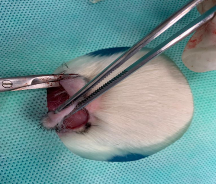 Todos os cuidados devidos para evitar o sofrimento do animal, desde sua aclimatação na sala, com ração e água livre, até cuidados especiais no pós operatório imediato com administração de analgésico diluído em água.