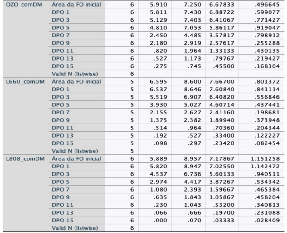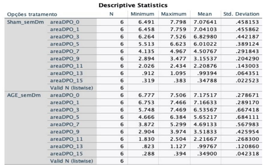 Tabela 3 – Evolução da área total da lesão nos dias 1, 7, 9 e 15 dos grupos controle, AGE e óleo ozonizado, com e sem diabetes mellitus.