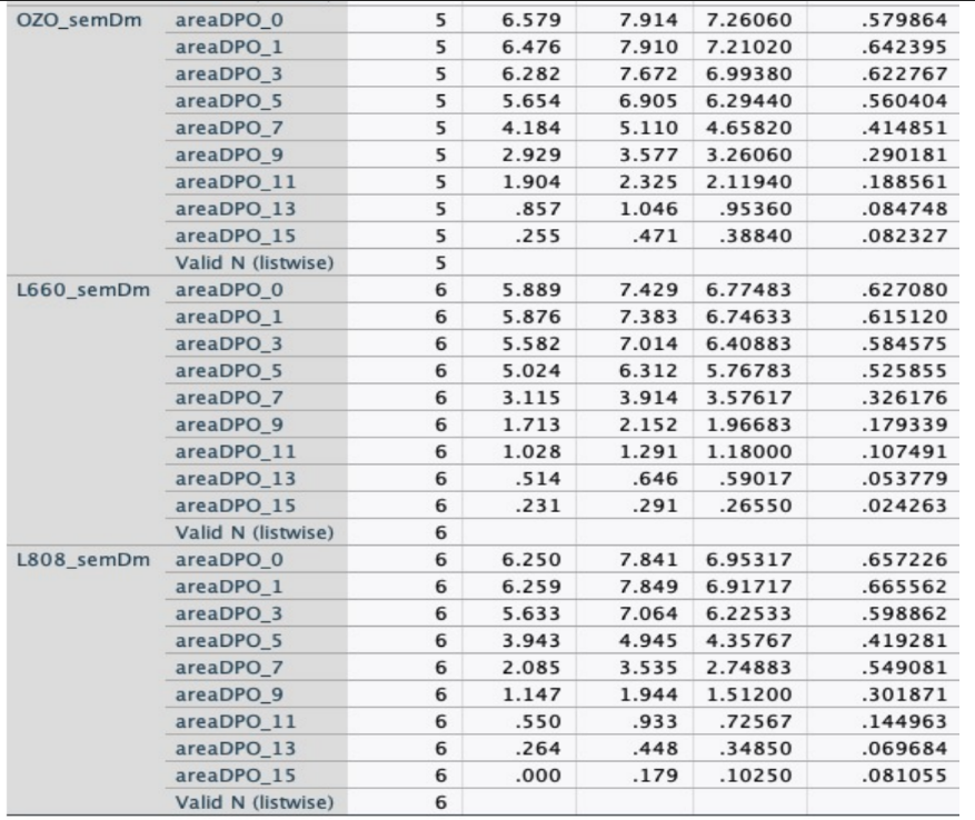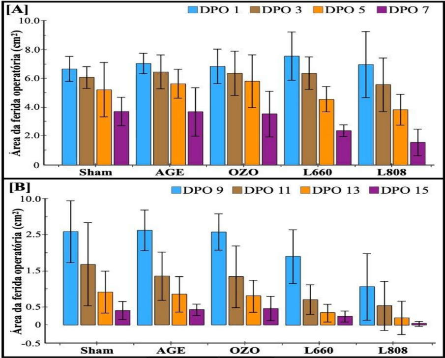 No 15º DPO começou a encontrar a ausência das feridas, as médias por grupo em ordem de menor área da ferida, foram grupo laser 808 com média de 0,03 cm2; laser 660 com média de 0,23 cm2; grupo controle com média de 0,40 cm2; óleo de girassol com média de 0,42 cm2; óleo ozonizado com média de 0,45 cm2 (Gráfico 4 – B).