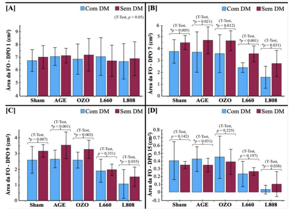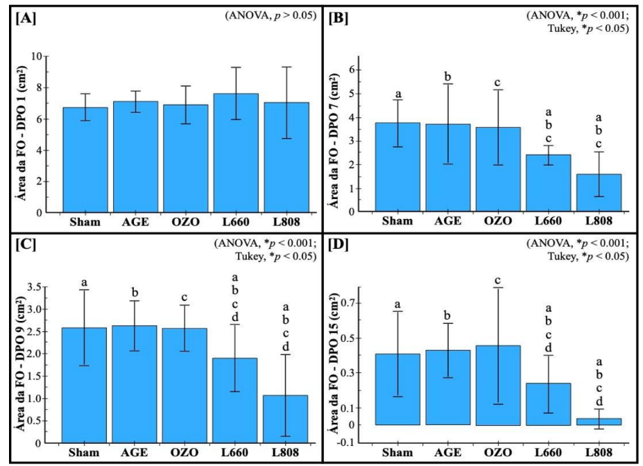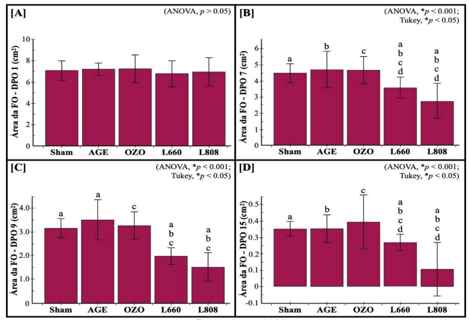 Quanto a avaliação da área total da ferida nos respectivos dias, entre o 1º e 3º DPO não foram encontradas mudanças significativas no tamanho da área da ferida, foi a partir do 3º DPO que pode ser visualizado uma menor área da ferida no Grupo Laser 808 com uma área média de 5,60 cm2, e os demais grupos apresentavam uma área média de aproximadamente 6,40 cm2, porém maiores mudanças significativas foram observadas a partir do 7º DPO em todos os grupos, prevalecendo ainda uma média de menor área de ferida no Grupo laser 808 com uma média de 1,59 cm2, seguindo depois o laser 660 com uma média de 2,41 cm2; óleo ozonizado com média de 3,57 cm2, e depois óleo de girassol com 3.71 cm2 (Gráfico 4 – A).