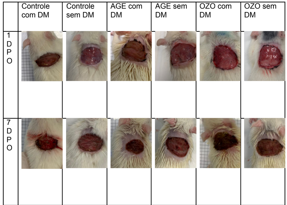 De acordo com o presente estudo avaliando o efeito do óleo ozonizado em lesões cutâneas em ratos diabéticos e não diabéticos, os resultados macroscópicos demonstraram que os ratos do grupo tratado com óleo ozonizado tiveram suas lesões cicatrizadas mais lentamente quando comparado aos ratos do grupo controle e óleo de girassol, contudo, não houve diferença estatística na comparação do tamanho das lesões entre os ratos com e sem diabetes.