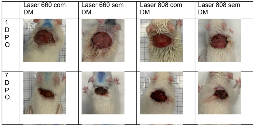 • Grupos Laser 660 nm (G4_L660 e G9_L660): animais com lesão cutânea tratada apenas com a terapia laser de baixa intensidade com 660 nm (vermelho).