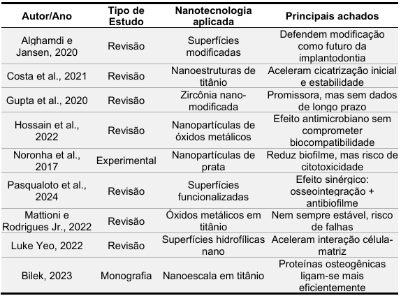 Após a seleção, os artigos foram analisados de forma crítica e comparativa, enfatizando tanto os aspectos positivos quanto os desafios e limitações relatados pelos autores. Essa estratégia metodológica permite traçar um panorama abrangente sobre o estado atual da nanotecnologia aplicada à implantodontia, oferecendo subsídios para a discussão científica e para possíveis aplicações clínicas futuras.