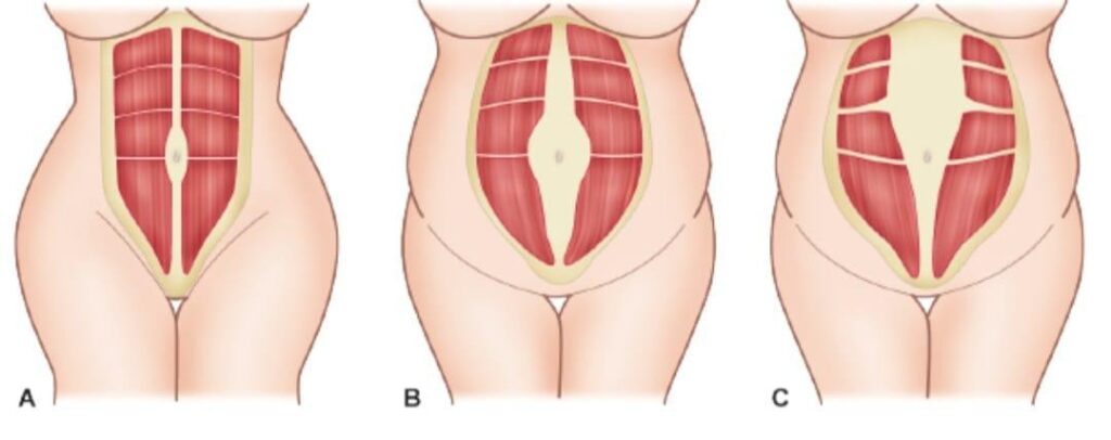 A diástase pode ocorrer acima, ao redor ou abaixo do umbigo, podendo envolver toda extensão da linha média, dependendo da gravidade e localização da separação muscular. (Mota et al., 2015).