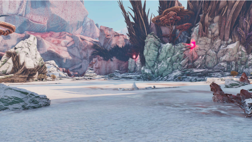 A Figura 1 ilustra um ambiente glacial amplo e aberto, com superfície congelada ocupando grande parte do primeiro plano. O médio plano é dominado por afloramentos rochosos de coloração esbranquiçada/esverdeada e por rochas rosadas com veios horizontais, sugerindo estratificação ou oxidação. Dispostas verticalmente no fundo, surgem estruturas espiculares de tom marrom-escuro, lembrando cristas cristalinas ou formações lignificadas, que acrescentam direcionalidade vertical e profundidade ao enquadramento. Há emissões luminosas magenta pontuais (cristais/rachaduras energizadas) que funcionam como acentos cromáticos quentes, rompendo a paleta fria dominante (azuis, cianos, brancos).