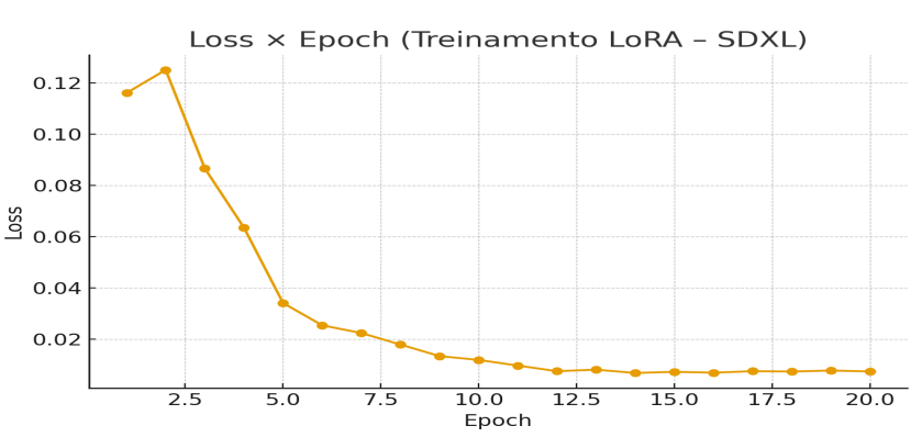 A curva de loss observada ao longo das épocas evidencia o comportamento esperado em cenários de memorização: queda acentuada nas primeiras iterações, seguida de estabilização, com oscilações que sugerem o início do sobreajuste. A identificação desse ponto de inflexão, utilizada para selecionar o checkpoint final, mostrou-se um critério prático e replicável, eficiente para aplicações que exigem fidelidade visual e não generalização semântica.