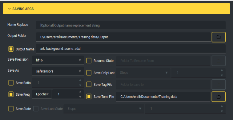 Figura 4 – Parâmetros de salvamento (SAVING ARGS): Pasta de saída (Output Folder), bf16, safetensors, Save Freq = 1 epoch, Save Toml File.