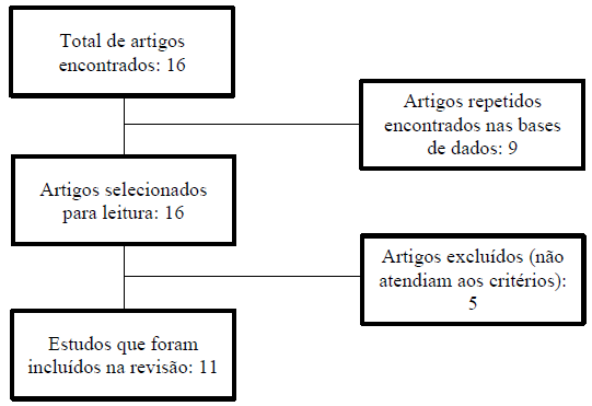 Foram encontrados 16 artigos nas bases de dados pesquisadas, dos quais 11 foram selecionados para compor os resultados da revisão. O processo de seleção está representado no fluxograma a seguir: