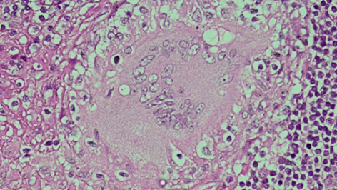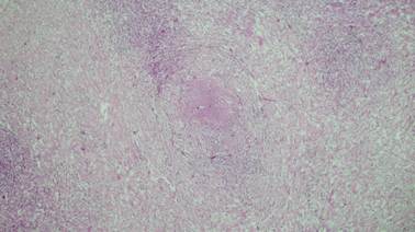 A mediastinoscopia com biópsia linfonodal revelou alteração histológica nodal, com substituição por um processo granulomatoso com necrose caseosa (Figura 2). Em virtude da suspeita persistente de malignidade e da ausência de diagnóstico definitivo, foi realizada toracotomia paraesternal esquerda com biópsia pleural. O exame histopatológico revelou granulomas constituídos por macrófagos, células gigantes multinucleadas e linfócitos, alguns com necrose central de padrão caseoso. Foram identificadas extensas áreas de necrofibrose, tecido de granulação e bandas colágenas compatíveis com processo inflamatório crônico granulomatoso (Figura 3).