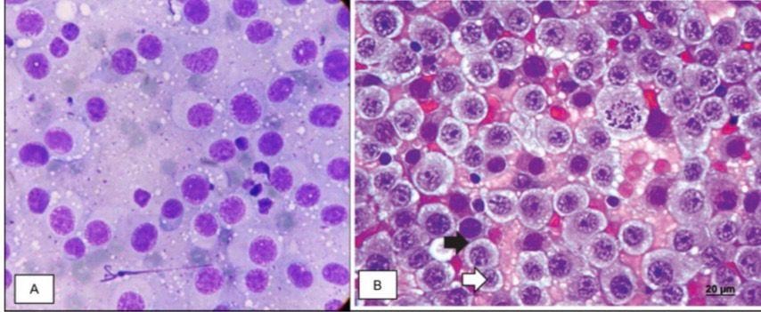 Figura 2: Aspectos morfológicos do TVT canino. (A) Padrão celular Plasmocitóide. (B) Padrão fenótipo linfocitoide (seta preva) e fenótipo plasmocitoide (seta branca).