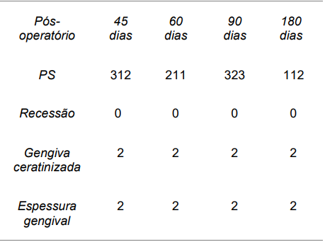 Os acompanhamentos iniciais foram realizados semanalmente para monitorar a evolução do caso. No pós-operatório de 7 dias, foi observada uma cicatrização satisfatória, momento em que as suturas do palato foram removidas. Após 14 dias, realizou-se a retirada das suturas da área receptora e dos pontos de ancoragem em resina composta. Nos retornos subsequentes, aos 21 e 30 dias, foram realizados controle de biofilme e reforço das orientações de higiene oral. Posteriormente, os retornos foram programados para 45, 60, 90 e 180 dias após a cirurgia, com o objetivo de avaliar os parâmetros clínicos, cujos resultados estão resumidos na Tabela 2.