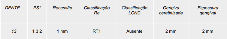 O exame clínico revelou boa higiene bucal, ausência de sinais de doença periodontal e fenótipo gengival fino. Na face vestibular do elemento 13, a profundidade de sondagem foi avaliada em três pontos utilizando uma sonda Carolina do Norte (PCPUNC 15): um ponto central na face vestibular e dois deslocados para mesial e distal, com valores de 1 mm, 3 mm e 2 mm, respectivamente. A recessão gengival (RG), medida da junção cemento-esmalte (JCE) até a margem gengival no ponto central, foi de 1 mm, resultando em um nível de inserção clínica de 2 mm. Não foram observadas perdas interproximais, classificando a recessão gengival como RT1, conforme a classificação de Cairo (2011), e não havia lesão cervical não cariosa associada.