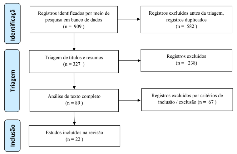 O processo de seleção seguiu um fluxo hierárquico. A busca inicial identificou um total de 909 registros. Após a remoção automatizada e manual de duplicatas, 582 registros foram descartados, restando 327 artigos para a triagem inicial baseada na leitura de títulos e resumos. Desta fase, 238 estudos foram excluídos por não atenderem aos critérios temáticos ou metodológicos preliminares. Os 89 artigos remanescentes foram submetidos à leitura integral (full-text review). Nesta etapa, 48 estudos foram excluídos devido à indisponibilidade de dados originais ou falhas metodológicas críticas, como a ausência de grupo controle em ensaios pré-clínicos, e 19 foram removidos por focarem majoritariamente em outros canabinoides. Ao final, 22 estudos satisfizeram todos os critérios de elegibilidade e foram incluídos na síntese qualitativa (Figura 1).