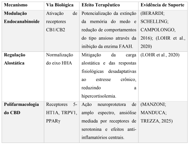 A revisão identificou mecanismos pleiotrópicos pelos quais o CBD pode exercer seus efeitos terapêuticos, restaurando a homeostase neurobiológica perturbada pelo trauma. As evidências apontam para uma ação tripartida envolvendo a modulação do sistema endocanabinoide, a regulação alostática do estresse e a polifarmacologia, conforme detalhado no Quadro 2.