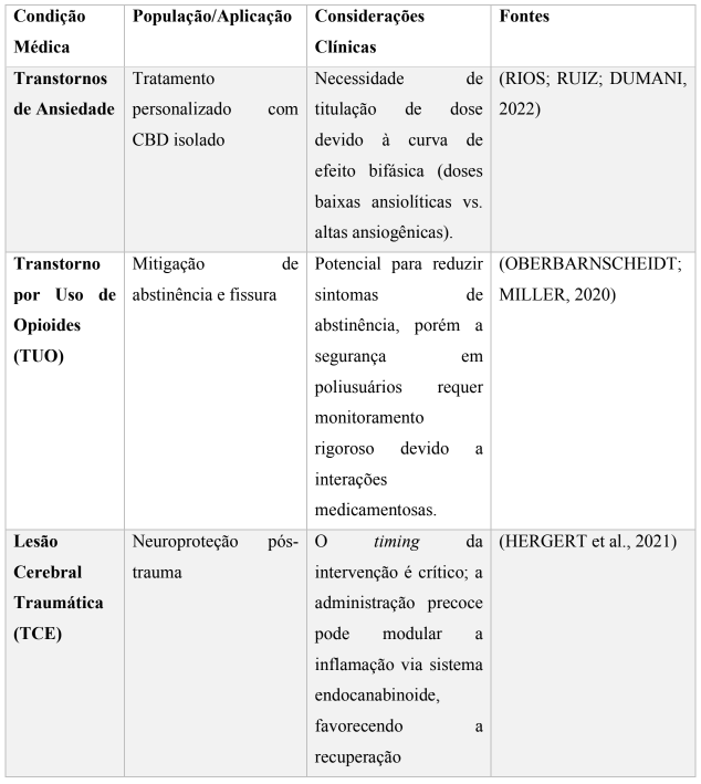A análise destas aplicações revela que, para populações com lesão cerebral traumática concomitante ao TEPT, o CBD pode oferecer benefícios duplos (neuroprotetor e psicotrópico), embora a janela terapêutica seja estreita. No contexto de abuso de substâncias, frequente em pacientes com TEPT, o CBD apresenta-se como uma alternativa não viciante capaz de atenuar o comportamento de busca por drogas, diferindo substancialmente das terapias de substituição convencionais.