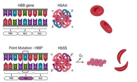 Fonte: Duyuran, R.; Kanbur Çiçek, H, (2024). Notas: Substituição de GAG para GTG no DNA, resultando na troca do aminoácido glutamato por valina na hemoglobina.